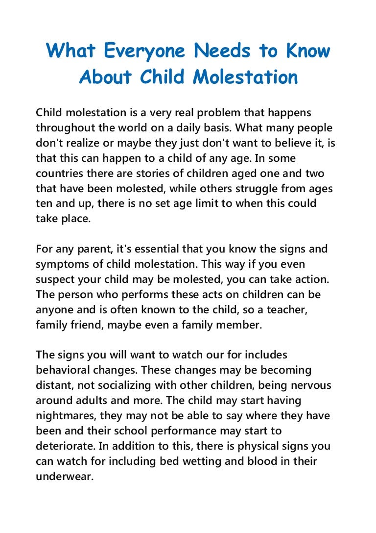 Englisch-Deutsch-Übersetzungen für to be molested im Online-Wörterbuch dictcc Deutschwörterbuch. He had been my counselor for three years was a school teacher somewhere and was very kind to me. I would kill anyone.